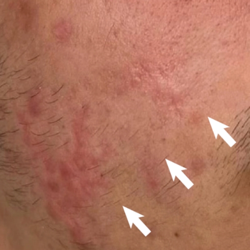 such as around the eyes, lips, and neck
